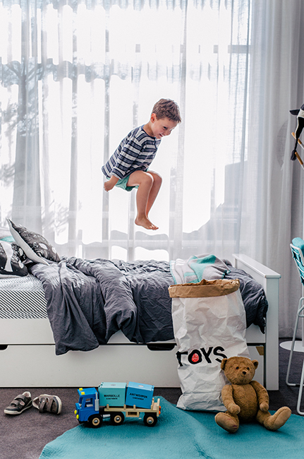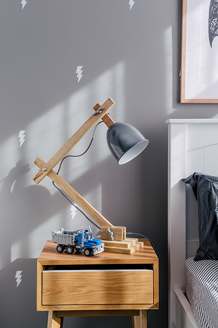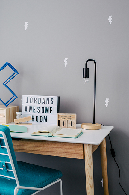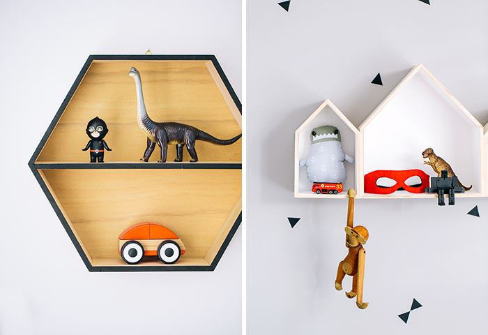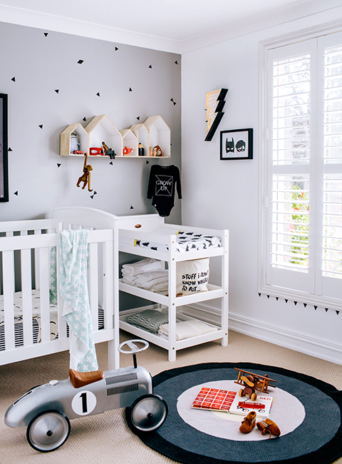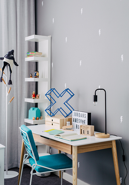 And now, my personal favorite: this gorgeous boy’s bedroom in grey, white, and hints of teal. I love this bedroom. I like that eventhough it’s quite grey, it’s fun, and even soft. I also love the playful touches and boy-ish accessories, such as the superheroes frame and pillows, or the little thunders on the wall. It’s so pretty I want it all for myself!