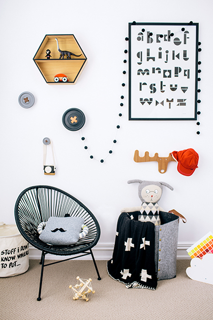 First up, a cool, black, white and grey bedroom with touches of wood. I love the playful and modern accessories used throughout.