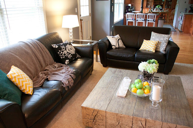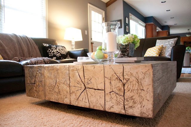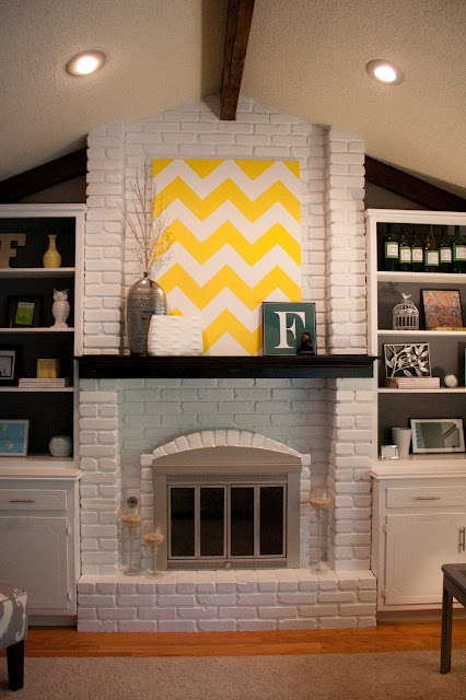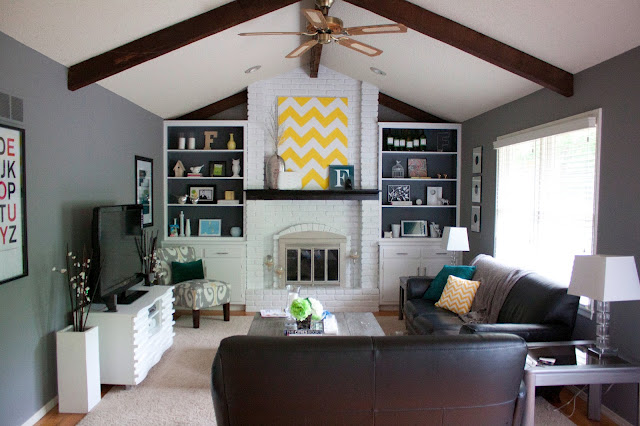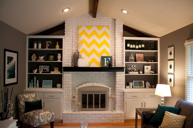 Much better, don’t you agree? Little changes made a huge difference. For starters, the brick wall was painted white. Then, the back of the built-ins was also painted, but navy blue, which added more depth to the space. There are many cute DIY details, such as the white and yellow chevron canvas, and the blue and white squares artwork. Now the living room looks much more contemporary, so much better! By the way, I love the coffee table. I want one!
