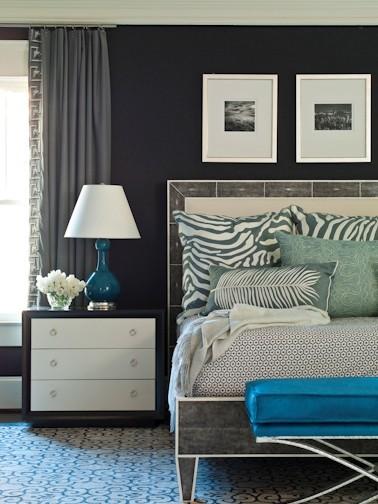 Diseñada por Brian Watford, esta recámara tiene detalles femeninos, pero también masculinos, lo cual la hace muy equilibrada. Me encanta el juego de tonalidades, que van desde el negro, hasta el blanco, pasando por grises azulados y detalles en azul turquesa… ¡buenísima combinación!