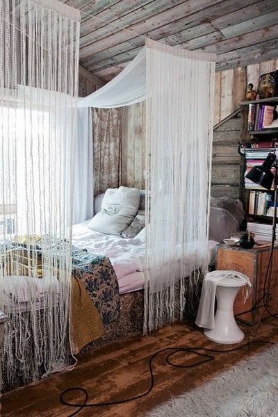 La cama con dosel, la madera virgen, todo al lado de la ventana… se ve tan acogedor.
