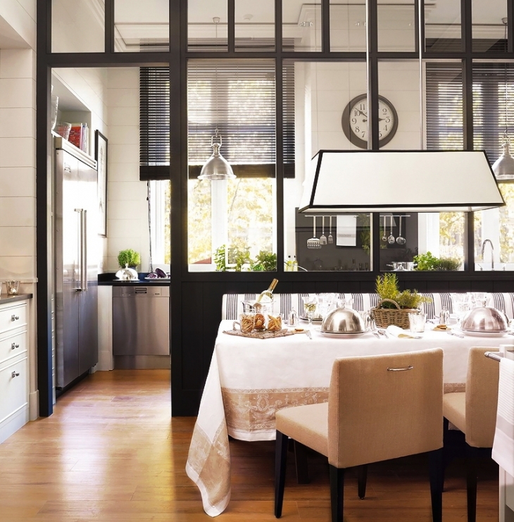 ¿No te parece una cocina (o comedor) fuera de lo convencional? A mí me encanta. La división con las ventanas internas, hace que el comedor se sienta un tanto a parte, a pesar de estar en medio de la cocina. Como sabes, soy fan de la combinación blanco y negro, que en este caso aporta un toque de elegancia clásica espectacular. Por si fuera poco, las lámparas estilo industrial y las alacenas abiertas la hacen moderna y muy especial. Una cocina verdaderamente increíble e inspiradora 🙂