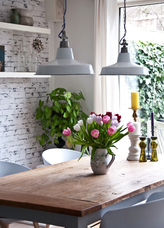 Hoy me siento de antojo… de antojo de rústico escandinavo 🙂 Y bueno, es que con este comedor tan divino, ¿a cualquiera no? ¡Increíble lo que se puede hacer con un espacio pequeño! Un muro de ladrillos pintado de blanco, la mesa tipo rústica, pintada de un azul cielo muy ténue, repisas, lámparas vintage (indispensables!) y unas buenas sillas modernas para que rompan con la monotonía y hagan contraste. La verdad que es un lujo tener un rincón así, ¿no crees? ¡Y más si está al lado de un patio para que entre mucha luz!