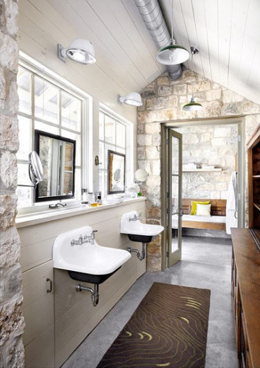 I love it all! The stone, the tub, the wood, the ceiling… sigh! Rustic and amazing!
