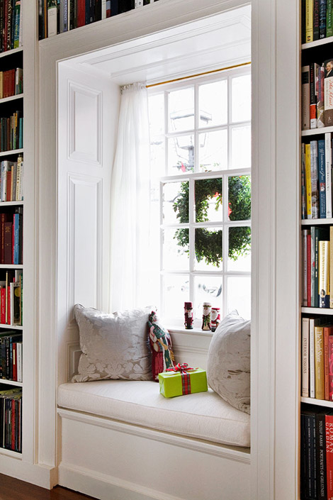 A veces, cuando blogueo sobre otras casas o diseñadores, me encuentro con la divina sorpresa de rincones al lado de la ventana. Casi siempre resultan ser mi lugar favorito de toda la entrada. Acogedores, se antojan ideales para sentarse y leer un rato, o simplemente acurrucarse bajo la ventana. Por eso, la entrada de hoy va dedicada a esos rinconcitos bien equipados para una tarde de descanso: cojines lindos, una manta, una lámpara y un buen libro. =) Me encantaría pasar uno de estos ricos días de invierno ahí (aunque bien podría ser un hermoso día de primavera, un tranquilo día de otoño, o mis favoritos: los lluviosos de verano).