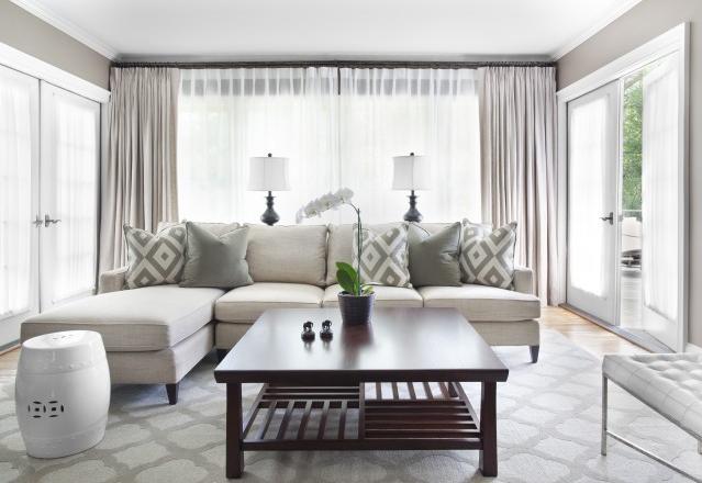 Simple and amazing, use a pattern, and pull a color for other cushions. In this living room, the gray is taken from the geometric pattern. Photo.
