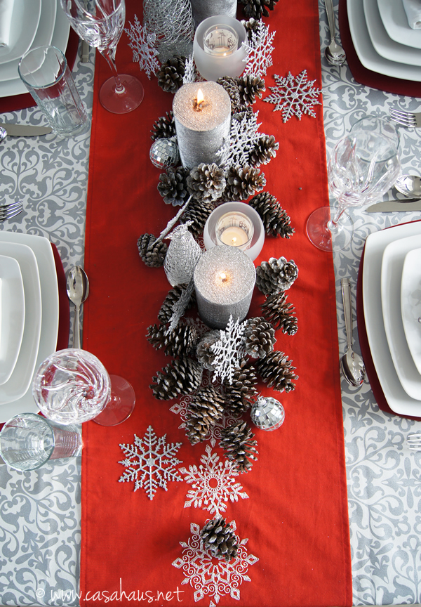 El camino rojo también es del catálogo de invierno de Vianney y se llama Noche de Paz. Adoro cómo hacen juego los copos de nieve bordados con los que puse de adorno, así como el bello contraste con el mantel.