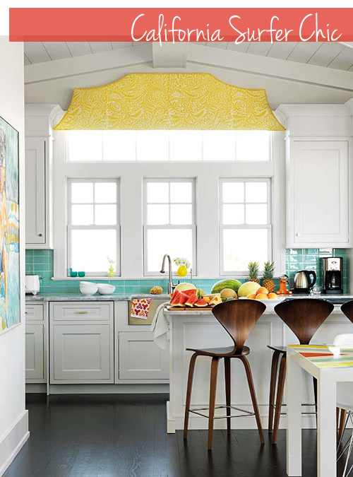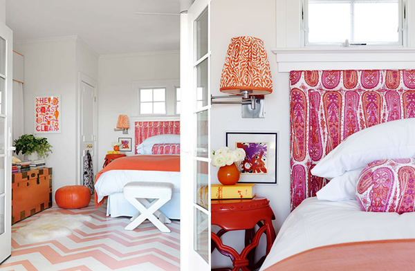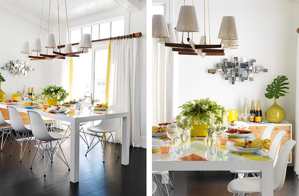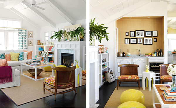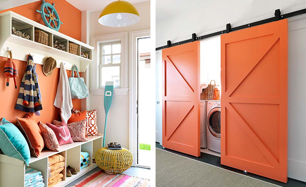 This home is the perfect prelude to the sweet summer days ahead. Designed by Mona Ross Berman in a style she defines as California Surfer Chic. I find it bright, welcoming, and colorful, of course. However, color is used as an accent toughout details and accesories, with a white background on almost every room, resulting fresh, practical, and very modern -something we can imitate in our own homes. The detail I loved the most: the orange sliding doors that hide the laundry room… gorgeous!