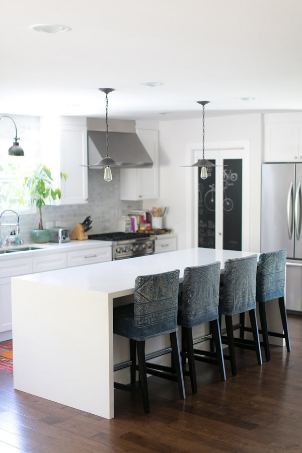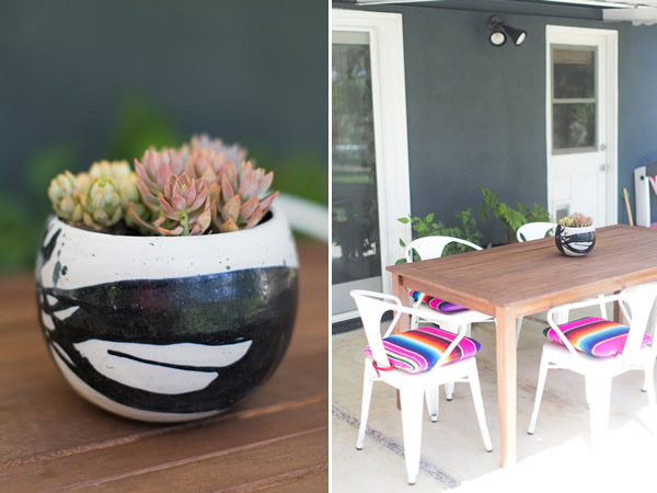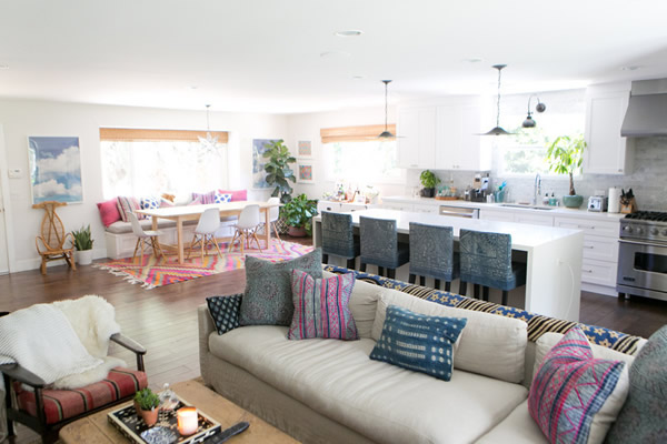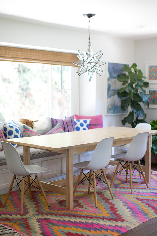 I love the use of textures and patterns, and how amazing they all look together throughout the house. There are many ethnic fabrics: batiks, moroccan pieces, and then of course, Mexican sarapes! They all add warmth and color to the contemporary casual look. My favorite space is definitely the dining nook, with the window, the built-in bench, the wooden table, the Eames chairs and the star pendant… how can there be so many things I adore together in the same space? It just looks perfect to me. 🙂 Which is your favorite?