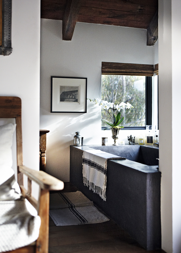 Definitivamente un hogar con mucho estilo, diferente a lo que solemos imaginar en Malibú, ¿verdad? Ya saben, yo soy fan del mix blanco, negro, madera, así que esta casa me llegó duro por ese lado, y también con esa pared tipo galería encima del sofá. Sin embargo, lo que me terminó de matar fue la recámara y… el baño. Ese baño. Me encanta el toque rústico de la tina de obra, sin azulejos ni mosaicos, la pared blanca con el cuadro, la madera… Me hizo recordar los días cuando, de chicos, nos llegamos a bañar al aire libre, en la “pila de agua” de mi tía. ¡Qué tiempos más lindos!