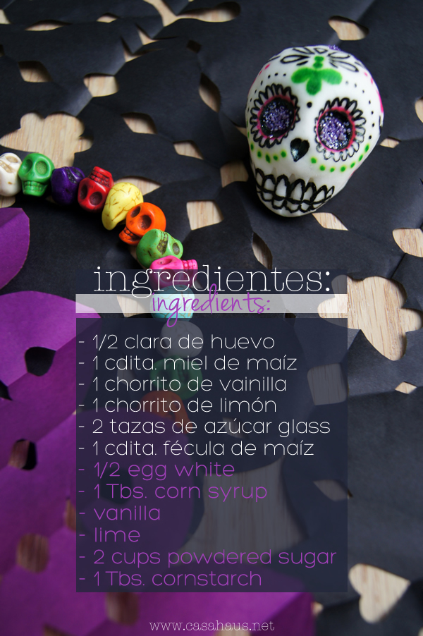 To make the sugar skulls, mix the egg white, corn syrup, a few drops of vanilla and a few drops of lime with a fork in a bowl. Then sift the powdered sugar on the mix. Incorporate with a wooden spoon, and then use your fingers to form a rather dry ball. The key is to feel the dough a little dry, because if it’s very maleable you’ll shape it nicely, but the figure will deform as it dries. Trust me. Divide the dough in three.