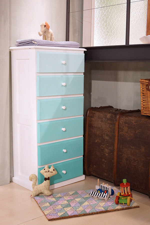 It’s well known that an image speaks for a thousand words, and this definitely applies right now. But I’ll try to explain. First, you have to count the number of “parts” you want to apply the ombre effect in, and that will be your “magic number”. In my case, it was 6 drawers, so 6 is my magic number, but this works well for any number, from 2 to 10, or even more. Then, you use that number of containers to prepare your tones. In each, you’ll prepare the mixtures always using your magic number of portions (for instance, spoonfuls). So, in the first one, you’ll have the total amount of spoonfuls in your color of choice, and little by little you’ll take one spoonful of color out, and one of white in, so that the total will always equal your magic number. The result will be a perfect ombré effect, going from the darkest to the lightest tone, gradually, not randomly 😉