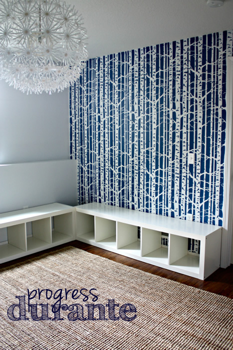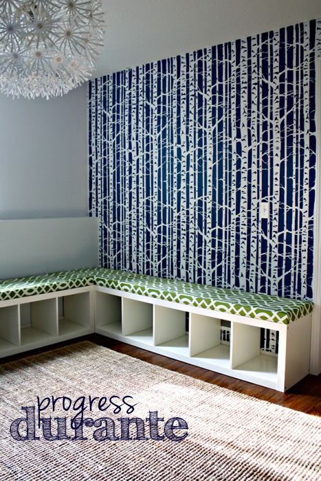 El librero que se usó fue el Expedit de Ikea, sin embargo y como puedes ver, se puede usar cualquier librero básico (acá en Guadalajara venden unos de pino en la calle). Me encanta cómo luce, especialmente el contraste de gráficos de la pared y el asiento. ¡Creo que se complementan muy bien!