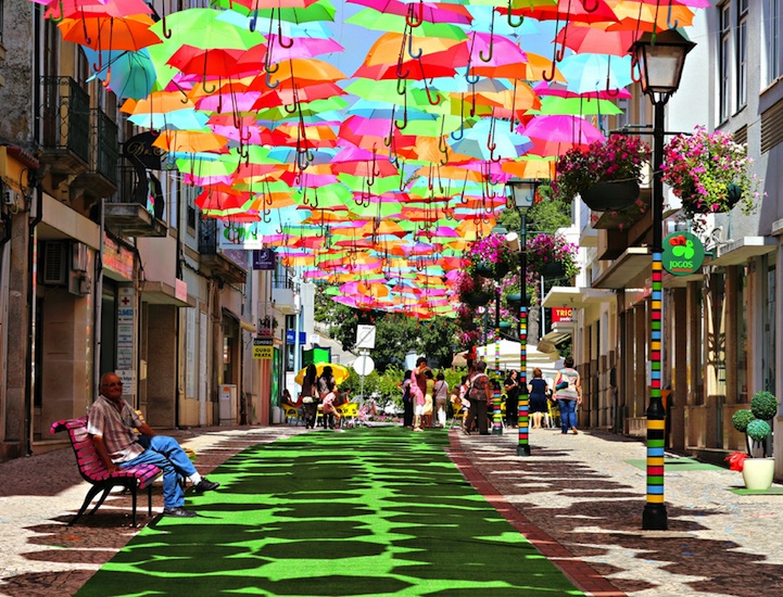 (In case you’re wondering, this is not a Photoshop work, it’s a real event that takes place in Agueda, Portugal during July. Umbrellas are suspended on wires strung between buildings for a happy and unexpected experience. Gorgeous!).