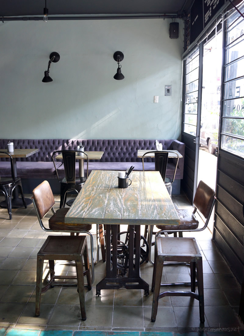 Just looking at the pics takes me back there, yum! As for the interior design, I love the vintage industrial style, with all that wood, cement tiles, dark gray walls, tolix chairs and metal stools, and that amazing bar with the meat and boards hanging above (does it remind you of a butcher shop too?). You can see I went in the afternoon, and I loved how the light entered through the windows, flooding the space. This is a great option for those living in Guadalajara or visiting. Really good food, in a really pretty place.