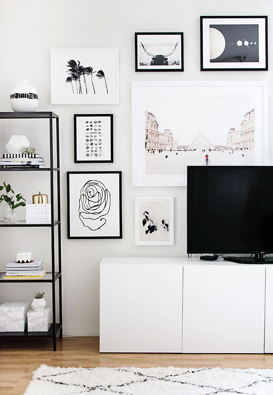 I remember the first time I saw this photo: it was love at first sight. The worn-out piece of furniture, the warm cream tone on the wall, and above all, the black and white pictures “randomly” arranged on the wall, around the tv. Such a perfect styling! Years have passed, but this image is still a personal favorite, and a go-to spot for me when I’m looking for inspiration. Well, turns out I recently came back to it, since I’m planning a TV gallery wall for one of my clients (I’m pretty excited about it). This is such a great idea to create a focal point and add character to any space, while integrating the TV as part of the composition. Actually, I just realized that, even though I’ve written several posts on gallery walls, I’ve never made one TV included. So today, I’ve got a special post for you: 10 awesome TV gallery walls. Whether you are a tv embracer or hider kind of people, this trend is for everyone, so I hope you’ll enjoy it!