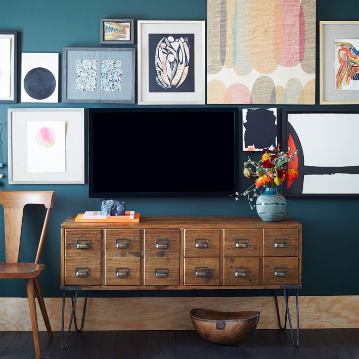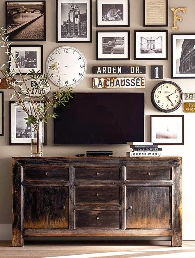 Recuerdo bien la primera vez que encontré esta imagen: fue amor a primera vista. El mueble avejentado, el color crema del muro… pero sobretodo, los cuadros blanco y negro acomodados de manera “aleatoria” sobre la pared, alrededor de la tele. ¡Qué estilismo tan perfecto! Años han pasado, pero esta imagen sigue siendo una de mis favoritas, de esas a las que regreso cuando busco inspiración. Bueno, pues resulta que hace poco “volví” a ella, pues justo estoy planeando un muro de cuadros para la pared de la tele de uno de mis clientes. Esta es una idea buenísima para incorporar esta tendencia en el hogar, creando un punto focal y dándole mucha personalidad a los espacios, al mismo tiempo que se integra la tv como parte de la composición. De hecho, ahora que la vi me di cuenta que, si bien ya les he contado varias veces sobre los muros de cuadros, nunca había sido con la tele incluida. Así que hoy les tengo preparado un post muy especial: 10 ideas para colgar cuadros alrededor de la tv. Espero lo disfruten, ¡y se animen a hacer algo así en su casa!