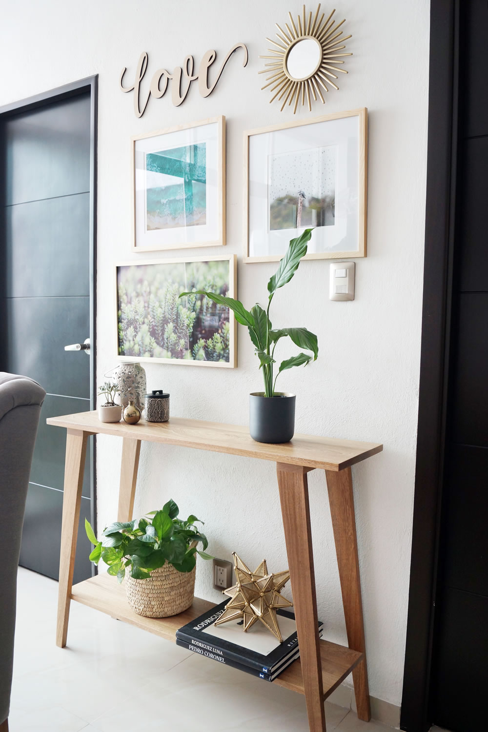 No sabría decir si la estrella del espacio es la lámpara, o este precioso rincón que creamos en el único murito disponible en el espacio. Es muy chiquito (mide menos de metro y medio de ancho), pero es justo el remate visual que tenemos cuando entramos a la casa, por eso me esmeré en hacerlo muy especial. En un principio, había pensado poner un gran espejo sobre la mesa, para rebotar toda la luz del ventanal y reflejar la lámpara increíble, pero luego, junto con la clienta, vimos que en la sala ya hay un espejo grande (y no tienen planeado quitarlo pronto), y por otro lado, también teníamos ganas de hacer un muro galería, con fotos alegres y elementos lindos que ayudaran a hacer muy acogedor el espacio. Yo creo que dimos justo en el clavo, ¿no creen? 🙂