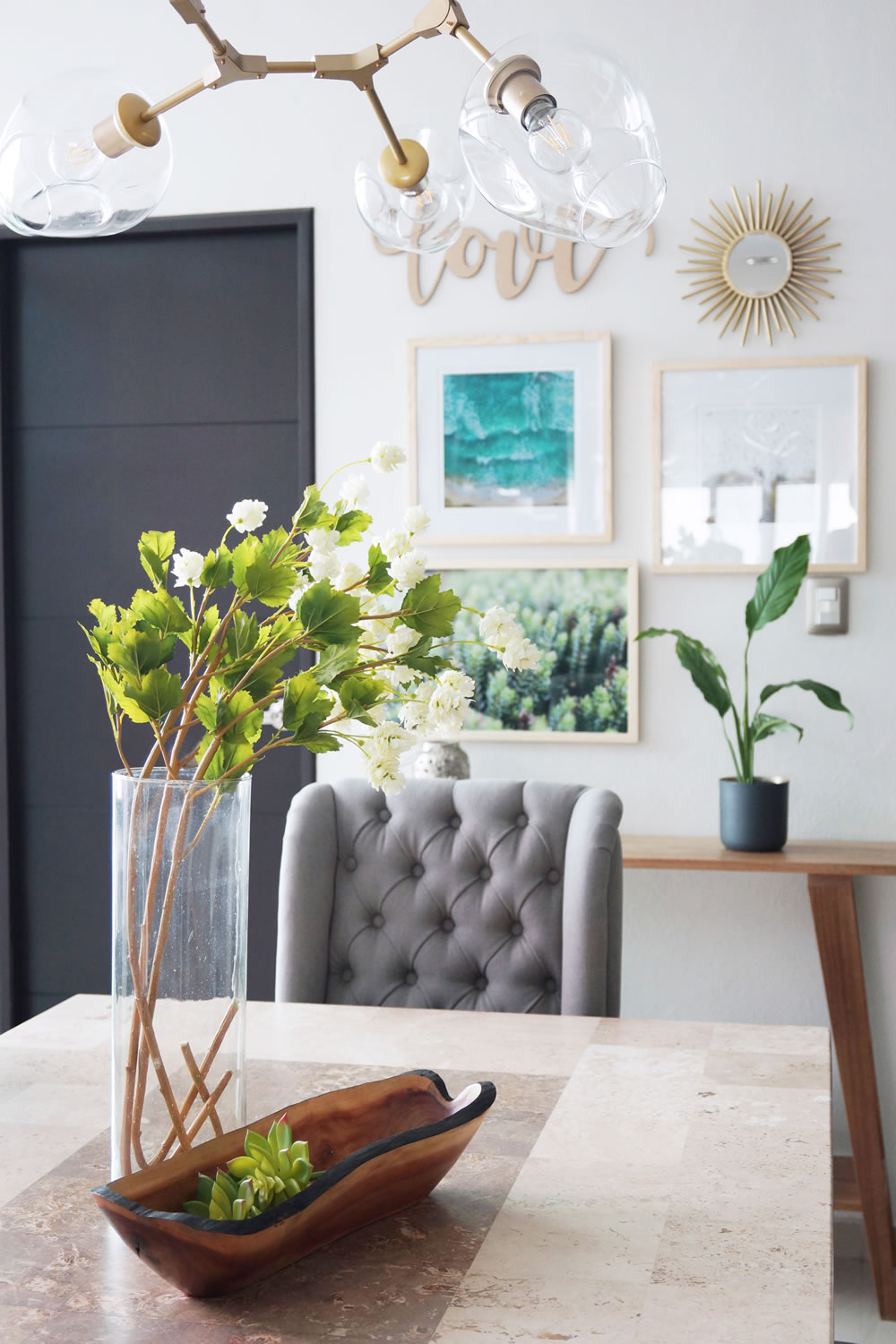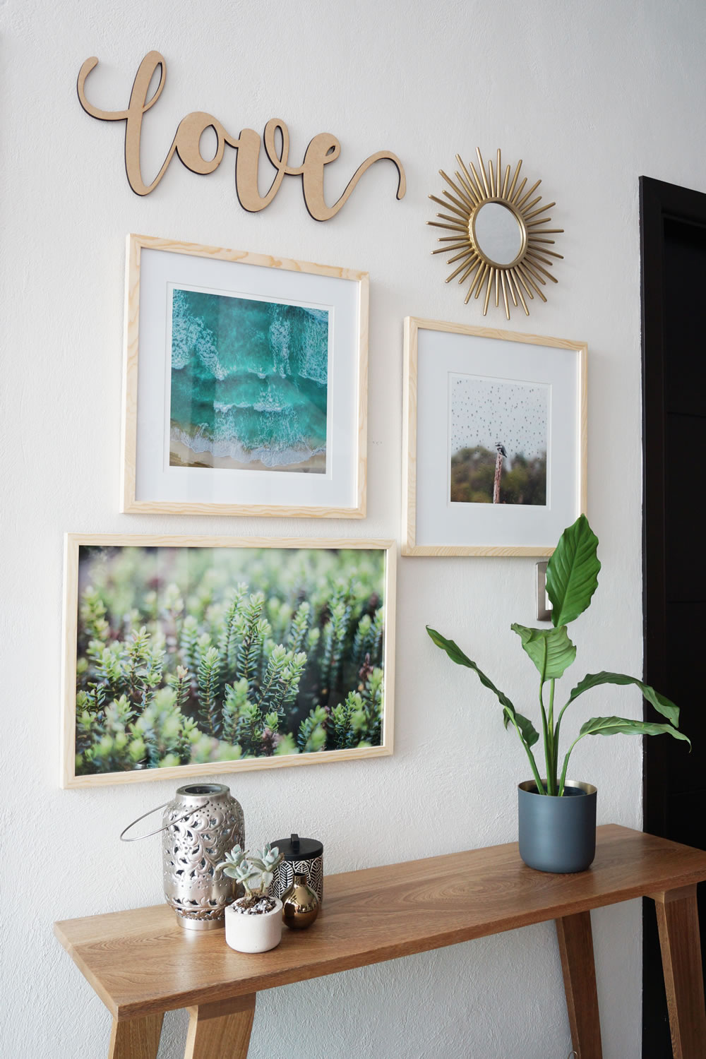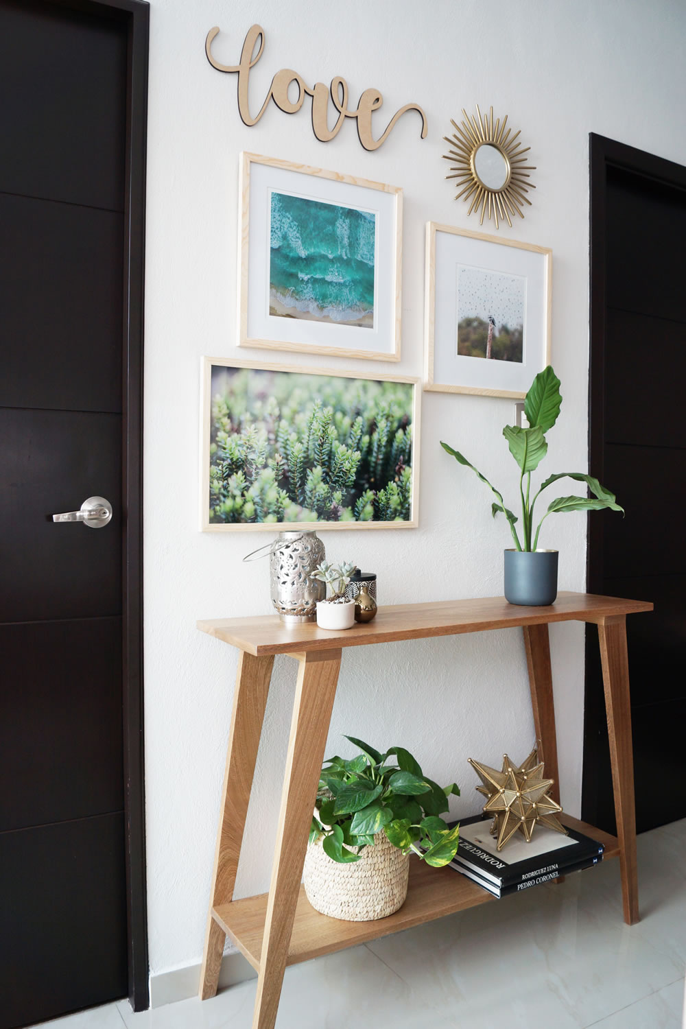 Para que este murito tuviera más impacto, decidí usar pocos elementos, pero de buen tamaño, en lugar de muchos pequeños… así se pueden ver desde lejos al entrar. Usamos fotografías de la naturaleza, me encanta cómo transmiten paz, pero también alegría. Para darle variedad, también colgué un pequeño espejo en forma de sol, y un letrero “love” que hice especialmente para el proyecto. Sobre la cubierta de la credenza, una “cuna de moisés“, la cual es ideal para interiores y da unas flores blancas preciosas (aunque a mí me encanta también sin flores).
