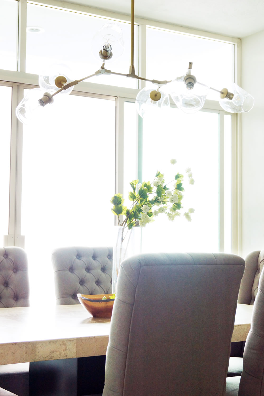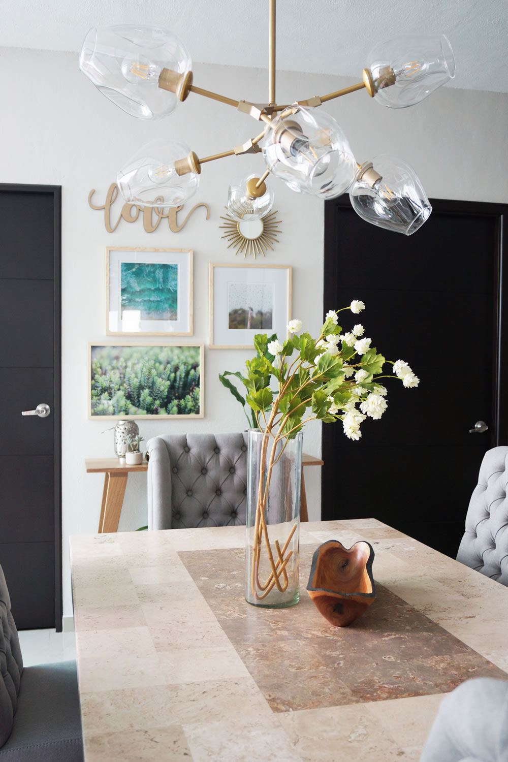 Por supuesto, un gran cambio fue la lámpara colgante, ahora mucho más adecuada para el tamaño del espacio, y a una mejor altura, más cerca de la mesa. Los clientes querían un modelo que no sólo fuera decorativo, sino que ayudara a dar buena iluminación, ya que es la única salida de luz en el espacio. Por eso les sugerí esta hermosura de lámpara, la cual me pareció ideal por muchas razones: su diseño es espectacular, el tono dorado da el toque sofisticado pero a la vez moderno al espacio, es ligera visualmente y tiene muchas bombillas, así que ahora hay mejor iluminación. Usamos focos led, así no se gasta tanta energía 😉