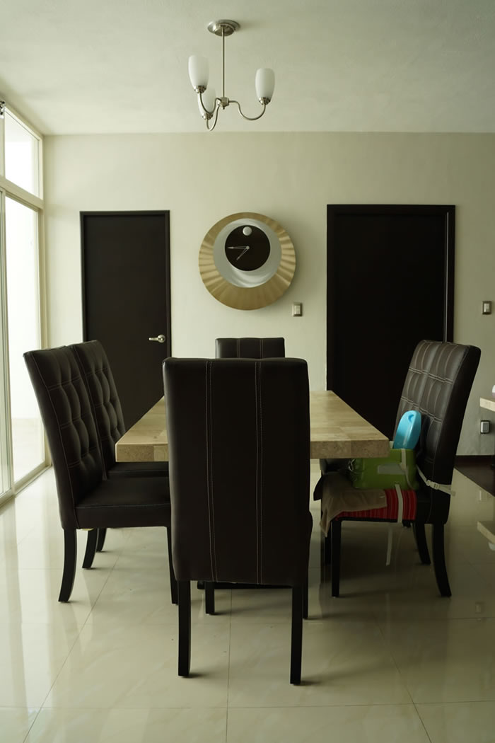 Como les decía, este comedor es lo primero que ves al entrar a la casa, así que había que hacerlo muy especial. Con un espacio generoso y una distribución súper abierta, tenía todo para brillar, pero no lo estaba haciendo. Y es que, se sentía un tanto vacío y frío, con el puro comedor en el centro, la lámpara tan pequeña en relación al espacio, y el reloj metálico (muy bonito, pero no quedaba muy bien ahí).