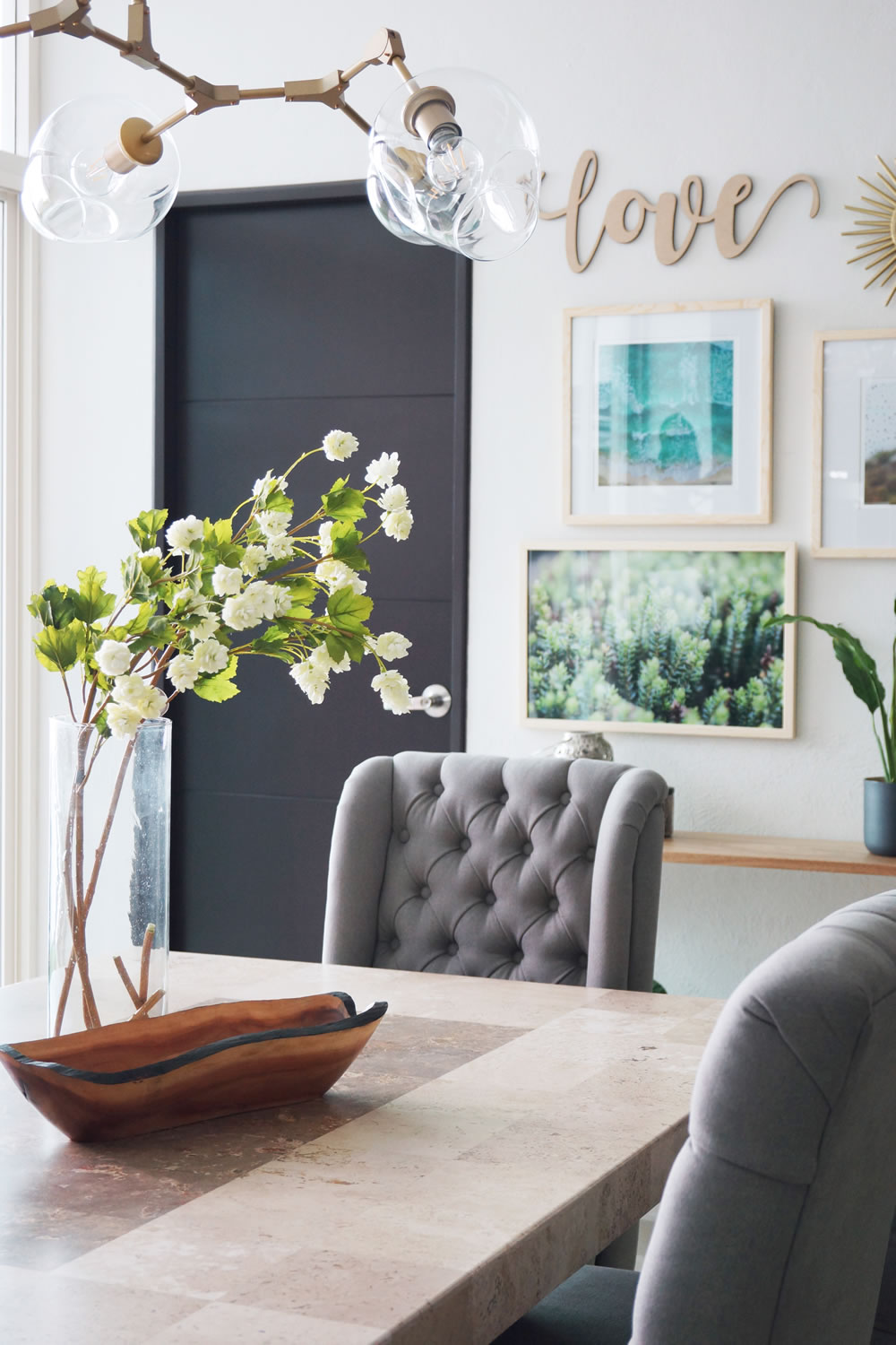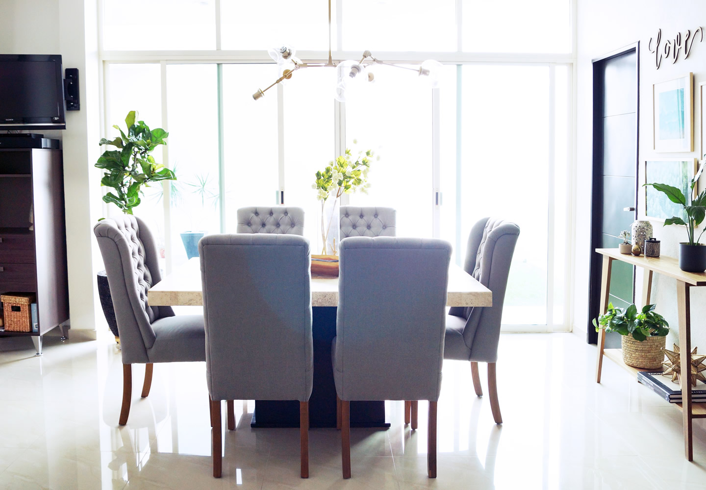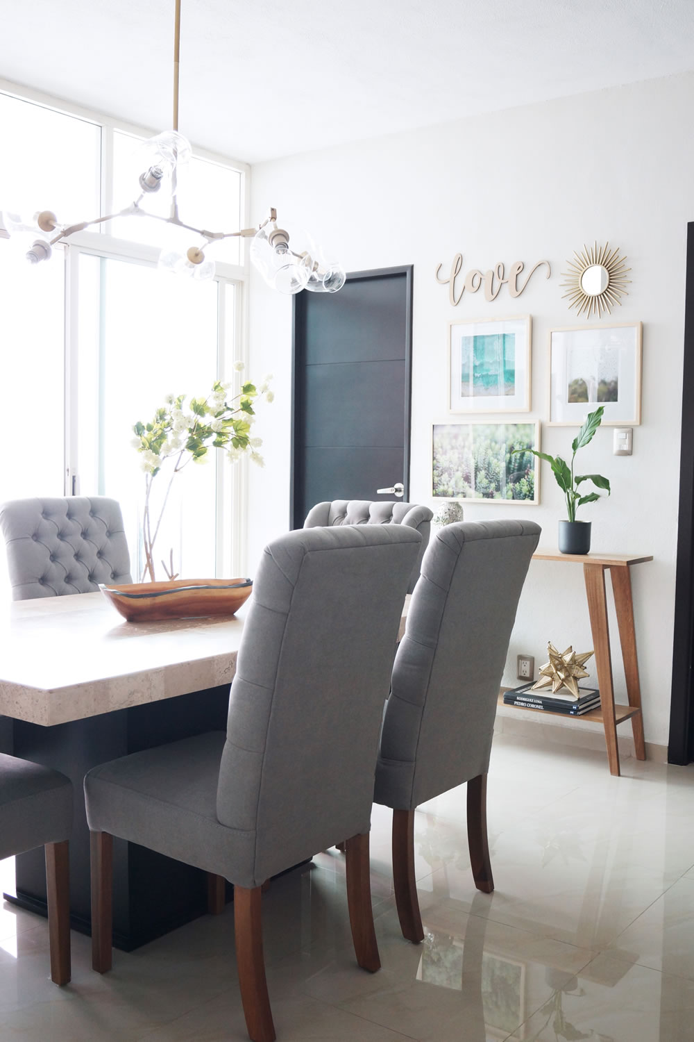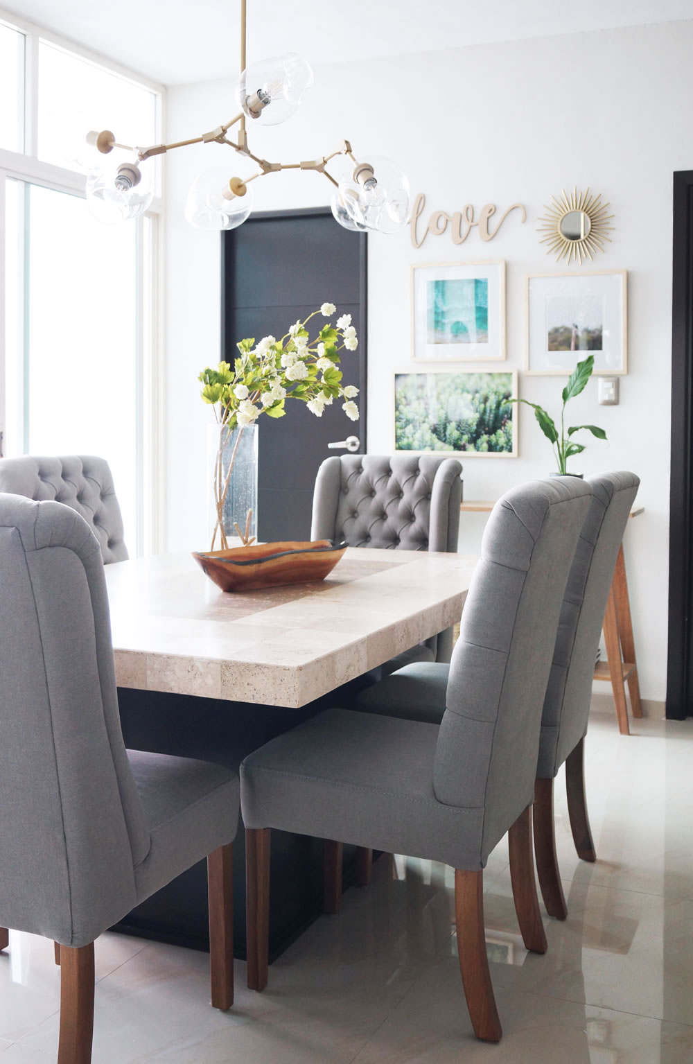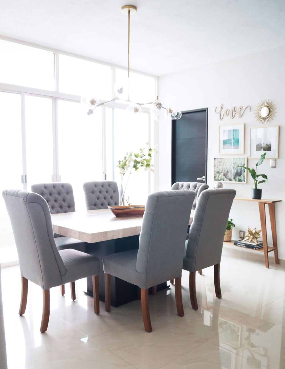 Es increíble cómo unos cuantos cambios hicieron tanta diferencia… ¡ahora el espacio se siente mucho más luminoso y acogedor! ¿Vieron que dejamos la misma mesa? Incluso les diré un secreto: también son las mismas sillas, nada más que las retapizamos, y les cambiamos el color de las patas. Este juego de comedor era de aquellos que se usaron hace mucho, seguro los recuerdan, cuando el color chocolate reinaba en la decoración. La verdad es que se sentía muy pesado, era oscuro y nada acogedor, y lo peor es que el vinipiel ya estaba muy lastimado. Ahora con la tela gris y el capitonado, se ve hermoso, cálido, contemporáneo… con una belleza atemporal. Y lo mejor, la tela es especial, ya que viene con teflón en las fibras, así que repele las manchas… ideal para ellos que tienen un niño pequeño.
