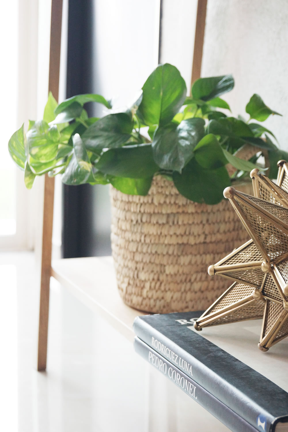 En la parte de abajo, una planta “teléfono” (también ideal para interiores) en una cesta de fibras naturales y del otro lado, unos libros de arte y una hermosa estrella que ya tenían los clientes y quedó perfecta en el espacio.