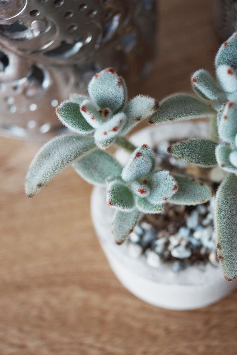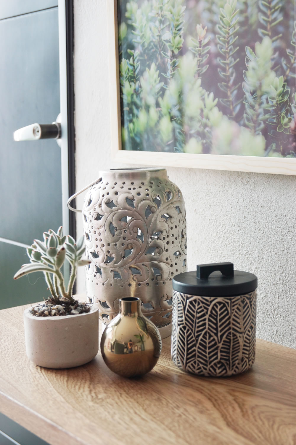 Del otro lado, un portavelas calado en plata para dar contraste, otros dos adornitos, y una linda suculenta en macetita de concreto.