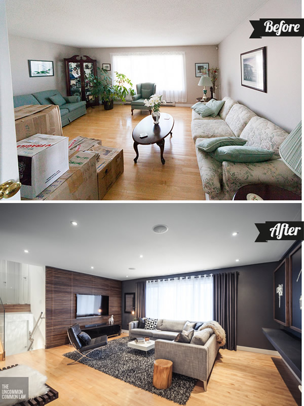 Adoro la paleta de colores (o no colores)… nunca me canso del blanco, gris y negro, y menos si van acompañados de detalles en madera. La pared de la tele es impresionante, y como les digo, más aún si consideras que ellos pusieron toda la madera. De igual manera, las piezas que están colgadas detrás del sofá son rayos x de cámaras antiguas… ¡súper ingenioso y sencillísimo! El espacio está mucho mejor aprovechado ahora, es muy acogedor, y me encanta el rinconcito de oficina, con sus repisas flotantes. Otro secreto para conseguir ese look de lujo, fue comprar la mayoría de los muebles en ikea, y tiendas accesibles, mientras que invirtieron en ciertas piezas clave, como la silla barcelona… un tip muy útil si estás pensando en renovar algún espacio.