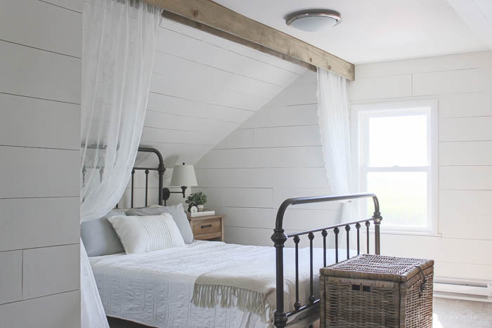 Hello and good morning! Today we’re waking up in a simple, yet truly amazing bedroom, how do you like it? It’s gorgeous, right? It’s owner, Liz, has been renovating her home little by little (I can’t believe I just discovered this talented lady), and I loved the last change she made so much, I had to share it with you. I love how sometimes the smallest details can make a huge difference, and her bedroom is such a great example. Of course, this was already a beautiful space: crisp white plank walls, a beautiful ironframe bed, pretty wood side tables, and white bedding…