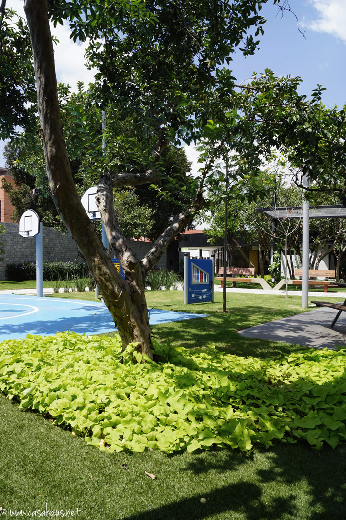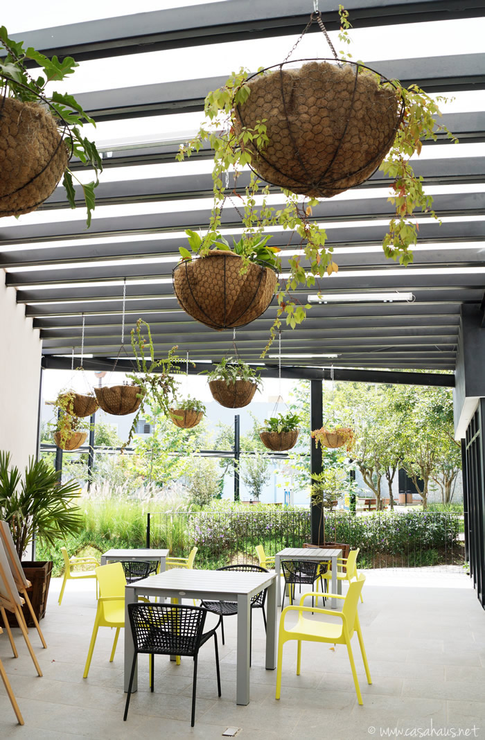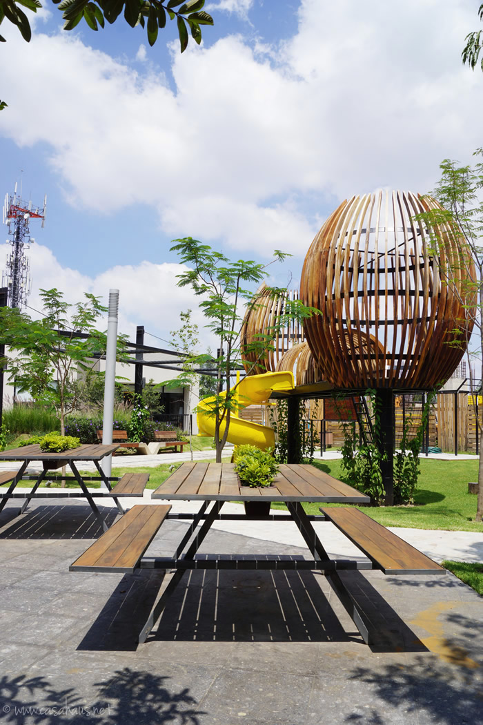 El área de juegos tiene “casitas” contemporáneas hechas de madera y acero que resultan muy esculturales. Las mesas con su camino de plantas vivas en medio también son lindísimas.
