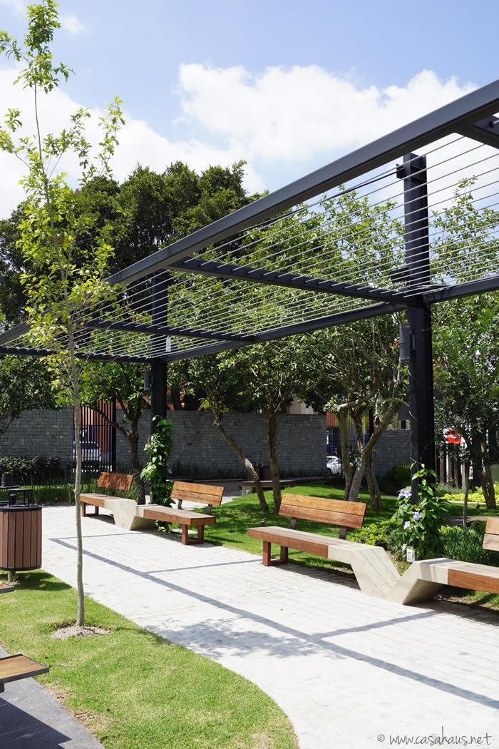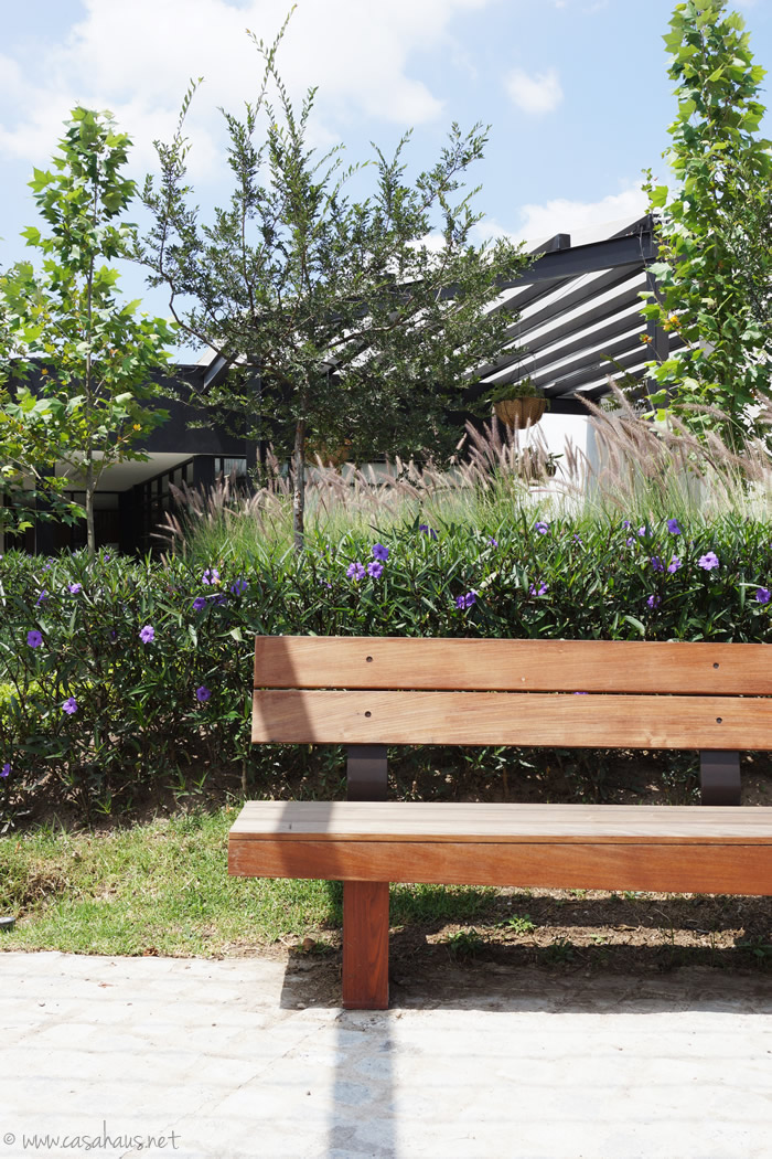 Me encantan los caminos y pequeñas veredas con bancas y estas estructuras de acero listas para recibir las enredaderas cuando estén más crecidas. ¿Se imaginan qué lindo caminar debajo de flores?