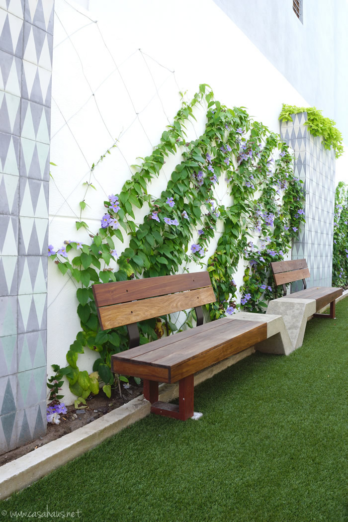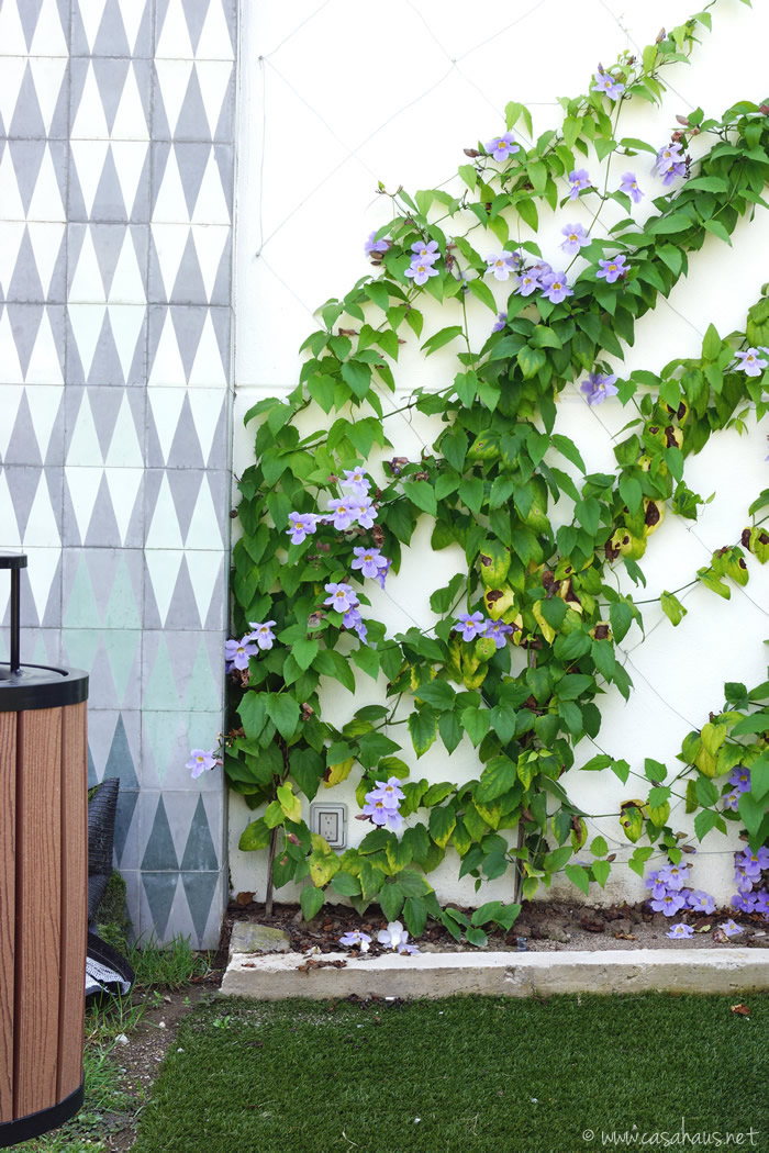 Me encanta la combinación de los mosaicos artesanales junto a la thunbergia grandiflora (acá conocida como pasiflora). ¡Amo el color lila de sus flores!