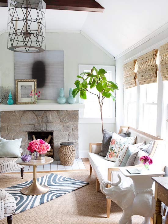 El día de hoy me siento inspirada con esta hermosa sala. Un azul ténue, casi imperceptible, como base, con capas de café, dorado y blanco… Tondos los colores son muy sutiles, armonizando perfectamente. Por último, detalles de la naturaleza, como flores rosas y una planta al fondo, para dar contraste y romper la monotonía… ¡qué belleza! Por cierto, esa lámpara está increíble, ¿no lo crees?