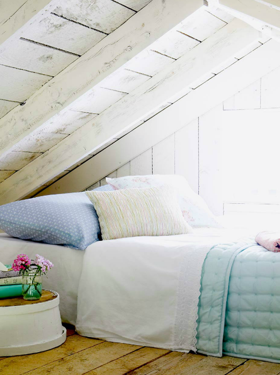 Here in Mexico, attics are only a dream, because houses here don’t have one. However, I’ve always felt fascinated by them. Sloped ceilings create nooks and intricate forms in spaces, which can be used in very creative ways, converting them into gorgeous escapes. And they can be used for any type of room, from bedrooms and home offices, to kitchens and bathrooms. There are attics large enough to home a big family, or tiny as a nook. My choice this time, after hours and hours drooling with amazing spaces, was this white and aqua paradise. I love white, and it reminds me of the long Winter we are living, and the pinks and aqua tones bring the memory of Spring to life. A small space it is, but inspiring as can be, don’t you think?