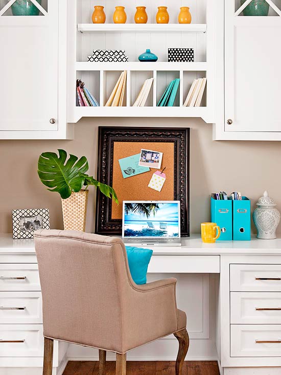The best thing about this kitchen is it’s got office space, with a full desk and drawers, shelves and everything I wish I had in my office.