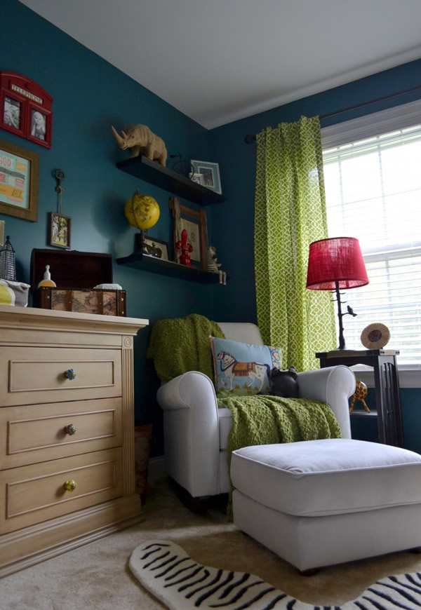 I love how the animal theme is present, in a joyful and yet mature way. I actually love how the room doesn’t look like the typical nursery. On one hand, the colors in the room are amazing -blues and greens in the most beautiful tones, ad then on the other, the accesories are sooooo cool (I love the zebra rug!). Then there’s also the stone wall, and plenty more details that make it really gorgeous. And even though it may seem serious, I find it totally fun and stimulating, ready to welcome the lucky baby.