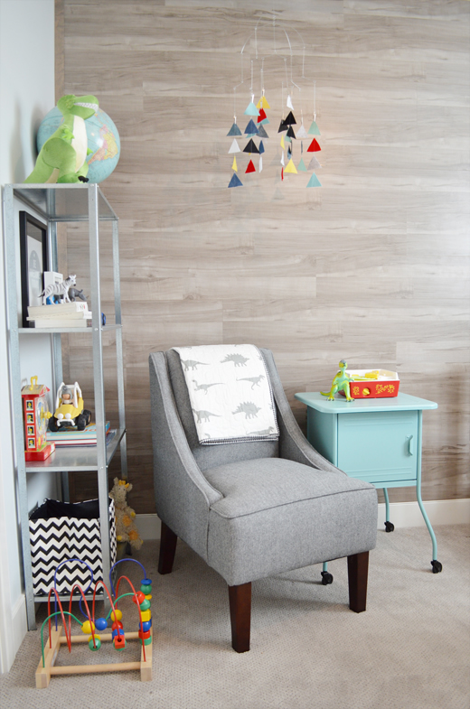 Isn’t it lovely? There are so many excellent ideas, like the laminate flooring on the wall, the triangles in the closet nook, or the baskets as shelving units… A really beautiful room that will grow as the baby does.