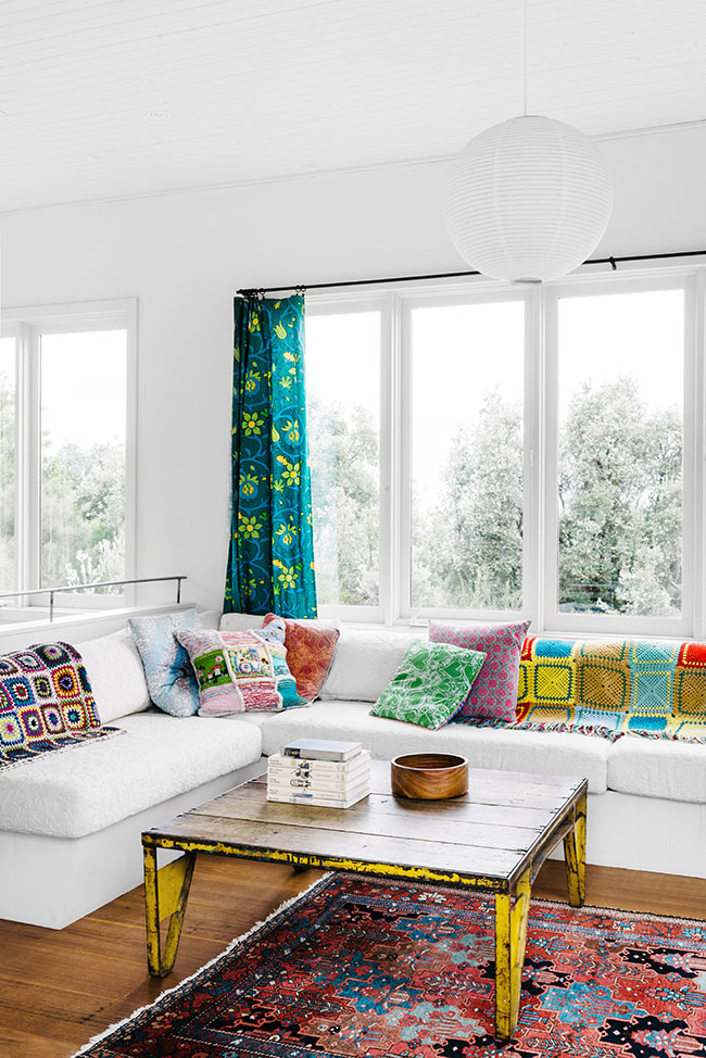 Una mesa desgastada es el toque justo para esta sala moderna. Su pintura amarilla queda preciosa con todo el blanco. (Por cierto, esta casa está llena de toques vintage increíbles, y la puedes ver aquí).