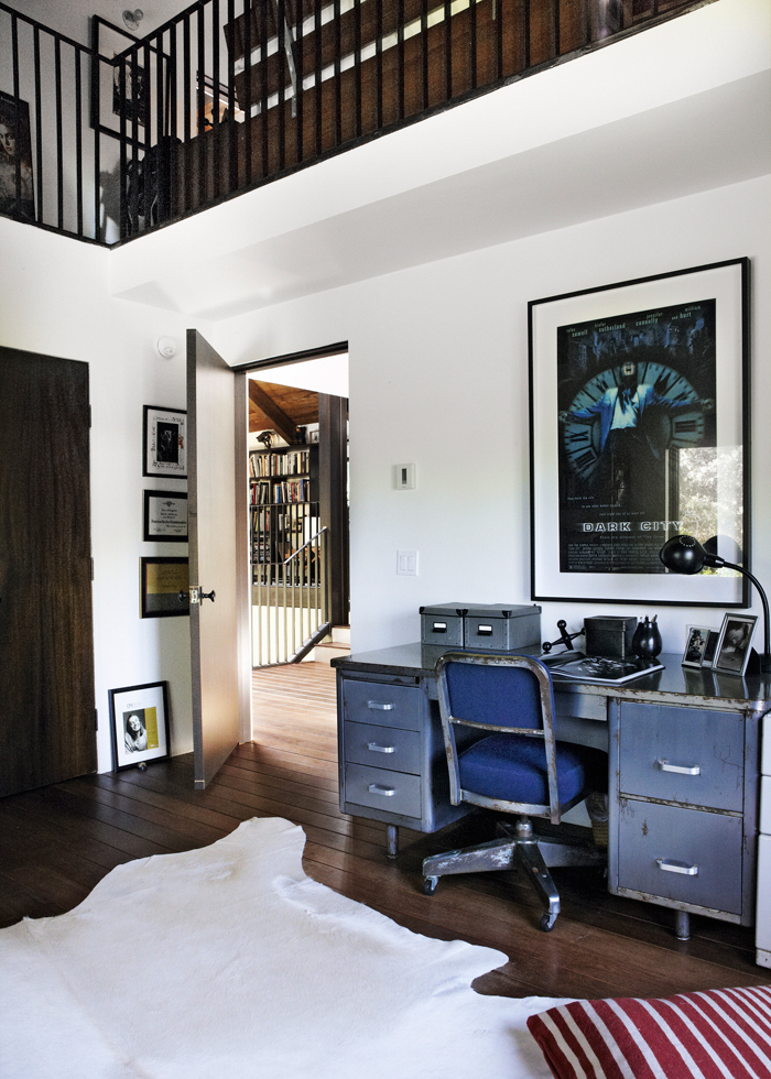 Un típico escritorio y silla de oficina de los años 70’s u 80’s arman un rincón con mucho estilo en esta habitación masculina con toques industriales. Esta casa tiene un toque rústico industrial increíble (el baño es de mis espacios favoritos!), y puedes verla acá.