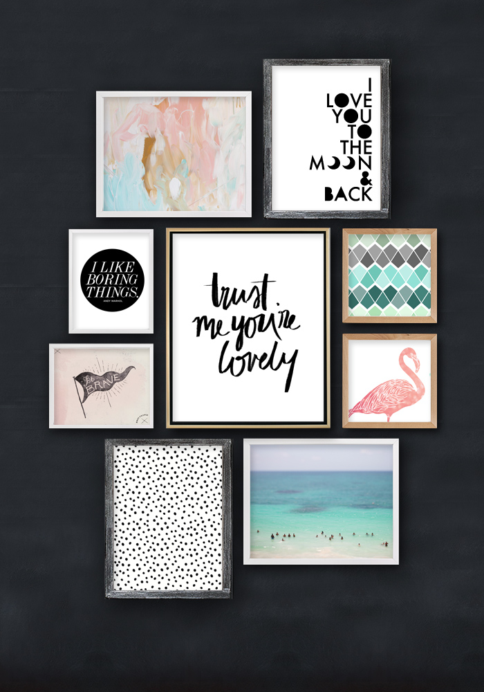 I have been asked if you can hang paintings along with posters and other things. Of course you can, everything goes! You can even hang objects you love, or have a special value to you and your family. You can mix and mingle, but there’s something to it: all the objects must feel right together, if you know what I mean. The best thing to achieve this is to place them on the floor, and watch them altogether. Play around with them. Once you like their arrangement, here’s a tip for you: take a photo and then hang them, whether it’s one by one, or tracing each frame onto a paper. The photo is very helpful so you can remember the arrangement and reproduce it on the wall, especially when there are lots of frames involved. 😉