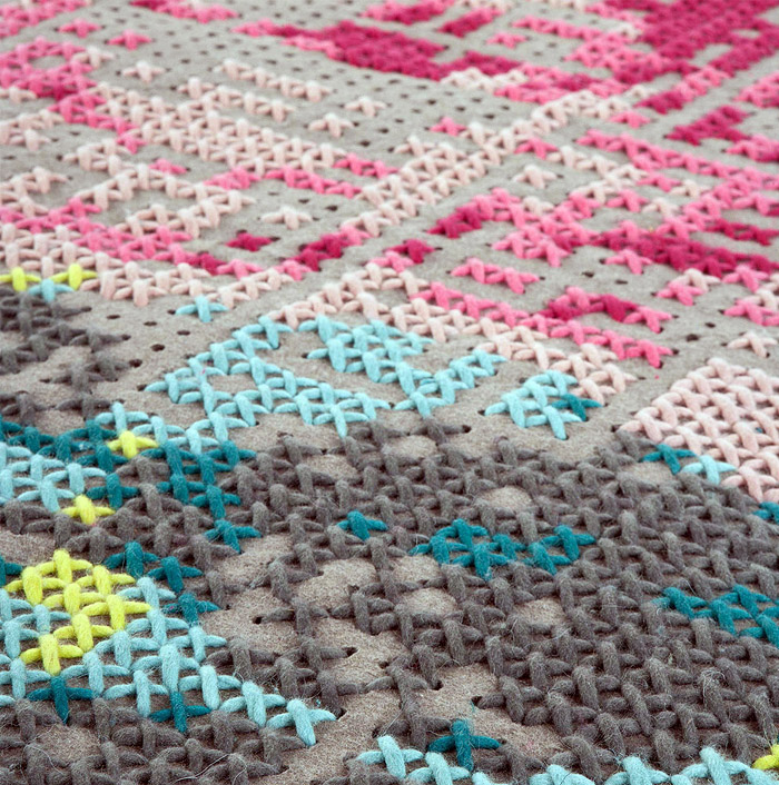 Ever since I was little, I’ve felt a true fascination over cross-stitch (and pretty much every handcraft whatsoever)… this is why I’m loving the newest collection by Charlotte Lancelot, Canevas, designed for Gan Rugs. The traditional stitch technique is reinterpreted with perforated felt and leather or thick yarn to produce gorgeous rugs, pillos and ottomans… perfect for contemporary homes. Someone get me perforated fabric now!!!