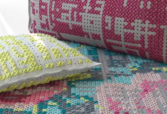 Desde pequeña he sentido una verdadera fascinación por el punto de cruz, por eso es que adoro la colección Canevas de Charlotte Lancelot para Gan Rugs. La técnica tradicional de bordado se reinterpreta con fieltro perforado y tiras de cuero o estambre muy grueso, para producir tapetes, cojines y otomanes alucinantes… ideales para la decoración contemporánea. ¡Que alguien me consiga un fieltro de esos!!!!!