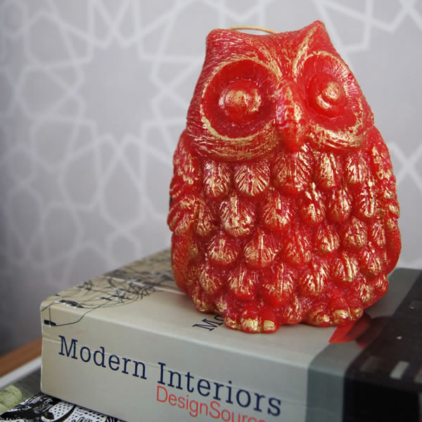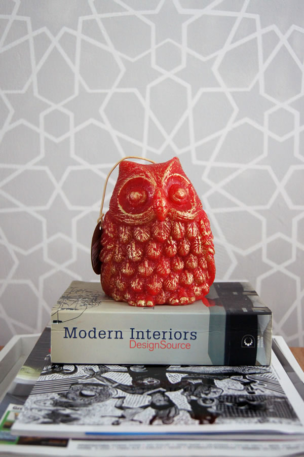¡Mi primera vela! (Sin contar, claro, el caso especial del Robert Pattinson que diseñé a principios del año). Me encanta el toque dorado que le dieron en la fábrica. Por supuesto, es muy divertido ver cómo el diseño se transforma de una idea a algo tangible. Y con lo mucho que se están usando los búhos, éste quedó genial en nuestra sala 🙂 ¡Espero que sea el primero de muchos!