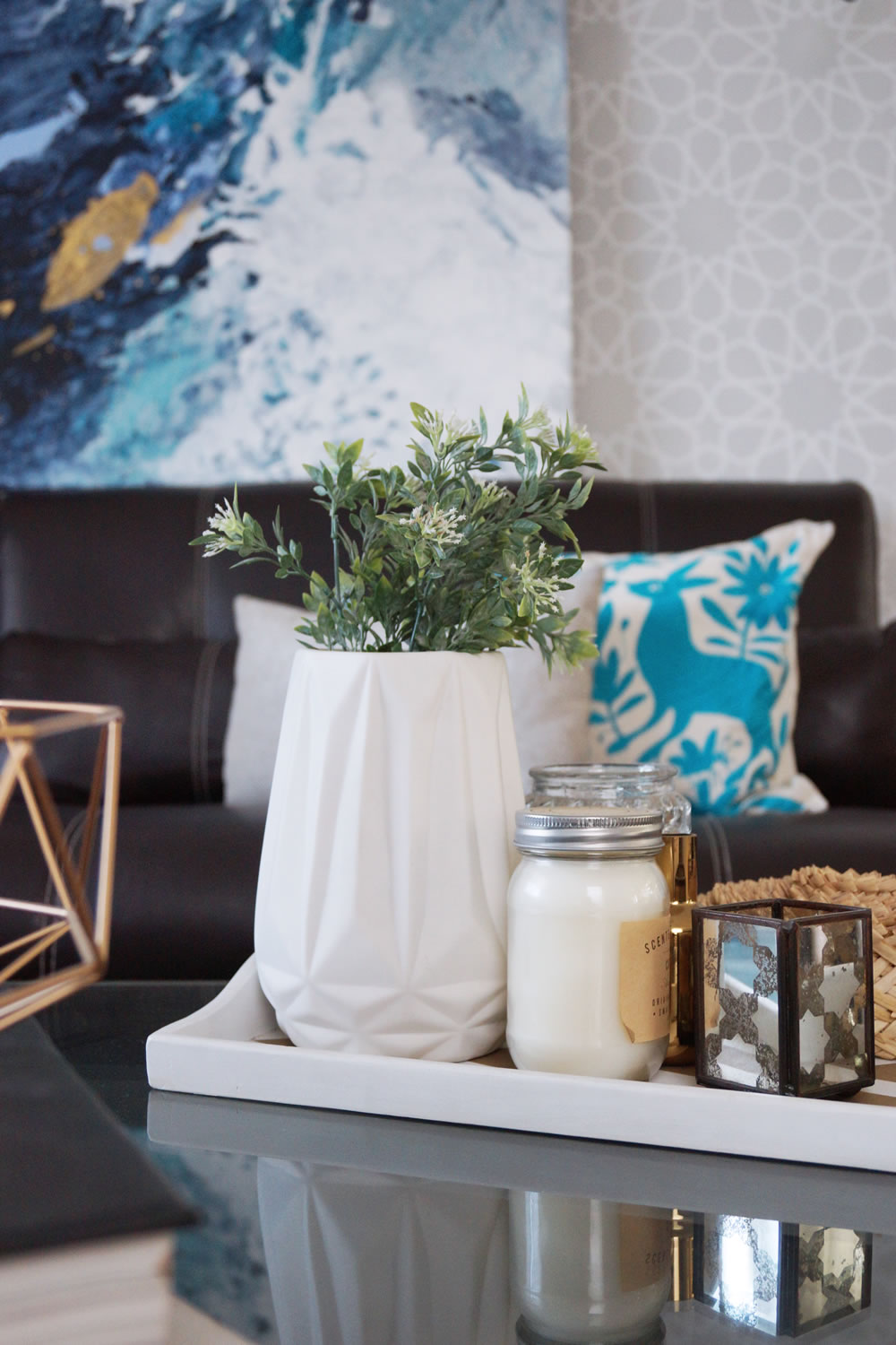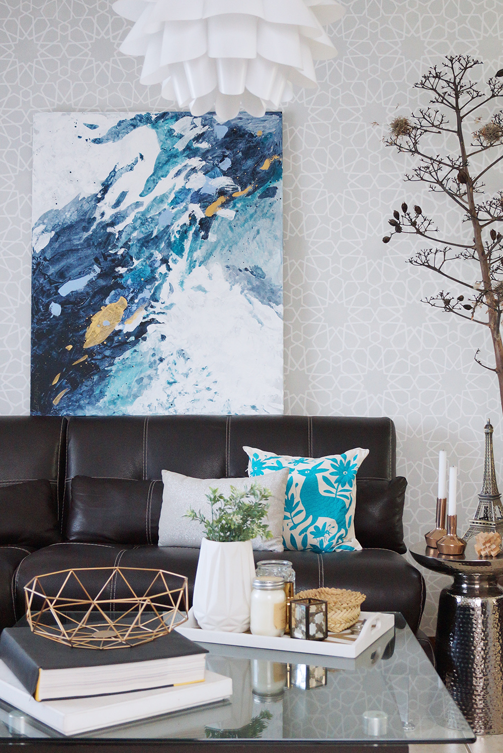 No sé si les conté, pero estas últimas semanas estuve pintando un cuadro para un proyecto con unos clientes. Hace años que no pintaba y, siendo una de mis más grandes pasiones, fue muy emocionante para mí volver a sacar mis pinturas y pinceles y dejarme llevar. Cuando lo terminé, lo recargué sobre la pared de nuestra sala, encima del sillón, para poder verlo terminado, y me gustó tanto que pensé hacer unas fotos para enseñarles!!! He estado pensando que, con la mudanza en puerta las próximas semanas, quizá son las últimas fotos que hago de éste, mi espacio favorito (y más fotografiado) en toda nuestra casa, así que siento un poco de nostalgia, ¿pueden creerlo? En fin, yo sé que ya casi nos vamos, y que además este cuadro pertenece a otro espacio, pero nos ha gustado mucho verlo en casa, al pasar por la sala. Si no fuera porque ya tiene dueño, ¡sí me lo venía quedando para decorar nuestra nueva casa!!!!! 😉
