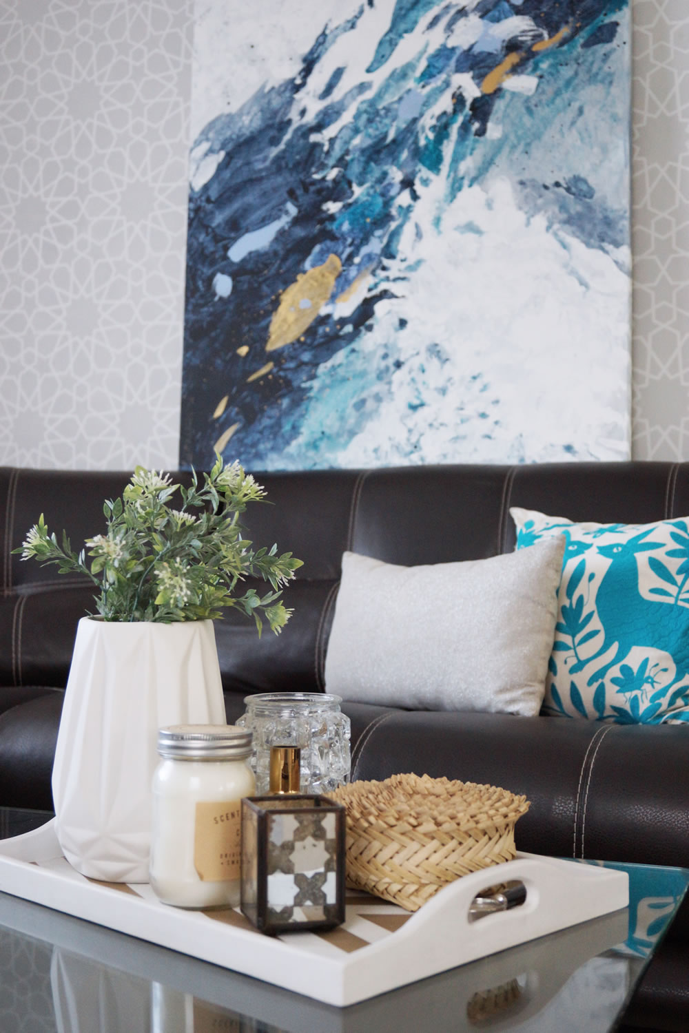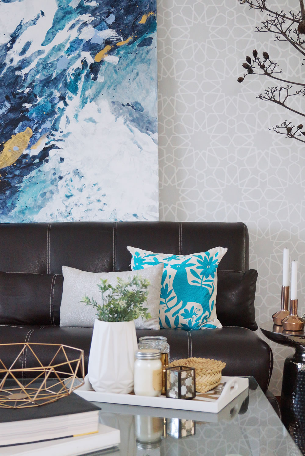 Y bien, ¿qué les parece???? El cuadro se llama “despertar”, y lo pinté en esos tonos de azul porque me encantan y me recuerdan al mar, que también me gusta tanto (además, que son los tonos precisos que necesitamos para el proyecto donde en realidad va a estar). Tengo que confesar, es la primera vez que pongo algo en esa pared, porque -ya saben- yo la pinté y nunca quiero colgarle nada por temor a lastimarla. Por eso fue que la recargué sobre el sofá. Pero me alegra haberlo hecho porque es un toque diferente en el espacio. Me encanta cómo coordina con el azul de nuestro cojín otomí, pero también me gusta cómo contrastan sus toques dorados, y su tamaño pareciera perfecto para el muro, jeje.