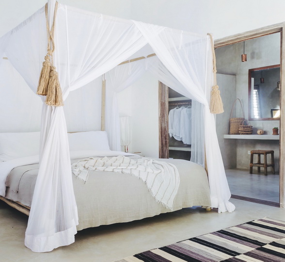 Hermosa cama con dosel y ropa de cama en fibras naturales.