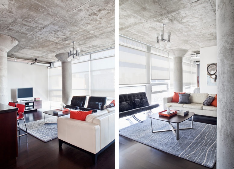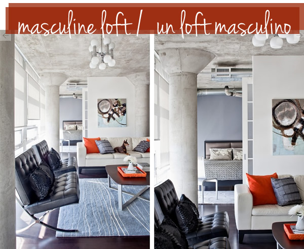 I found this home in my design files and I knew I had to share it with you. I love the clean and masculine décor, the simple palette, the concrete columns and ceilings… I just find it irresistible. There are several things worth pointing out: to begin with, the cool kitchen that looks like a bar, the living room with Barcelona chairs and the winning combo: gray-orange, and finally, the gorgeous bedroom with the gray wall… This loft was designed by Rad Design Inc. and I belive they did a wonderful job! By the way, did you notice how the dining room table bends to close into a buffet? Amazing!