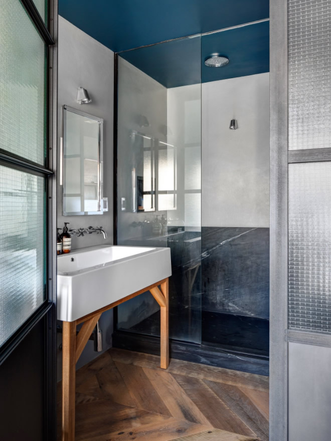 In the bathroom, wooden floors, concrete gray walls (love thim), the blue ceiling, and an amazing, vintage industrial style I love.