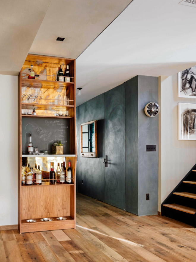 Miren qué buena idea para aprovechar un pequeño espacio en el pasillo, con este bar. Me encanta la manera en que integraron los bowls para la comida de los perros. 😉